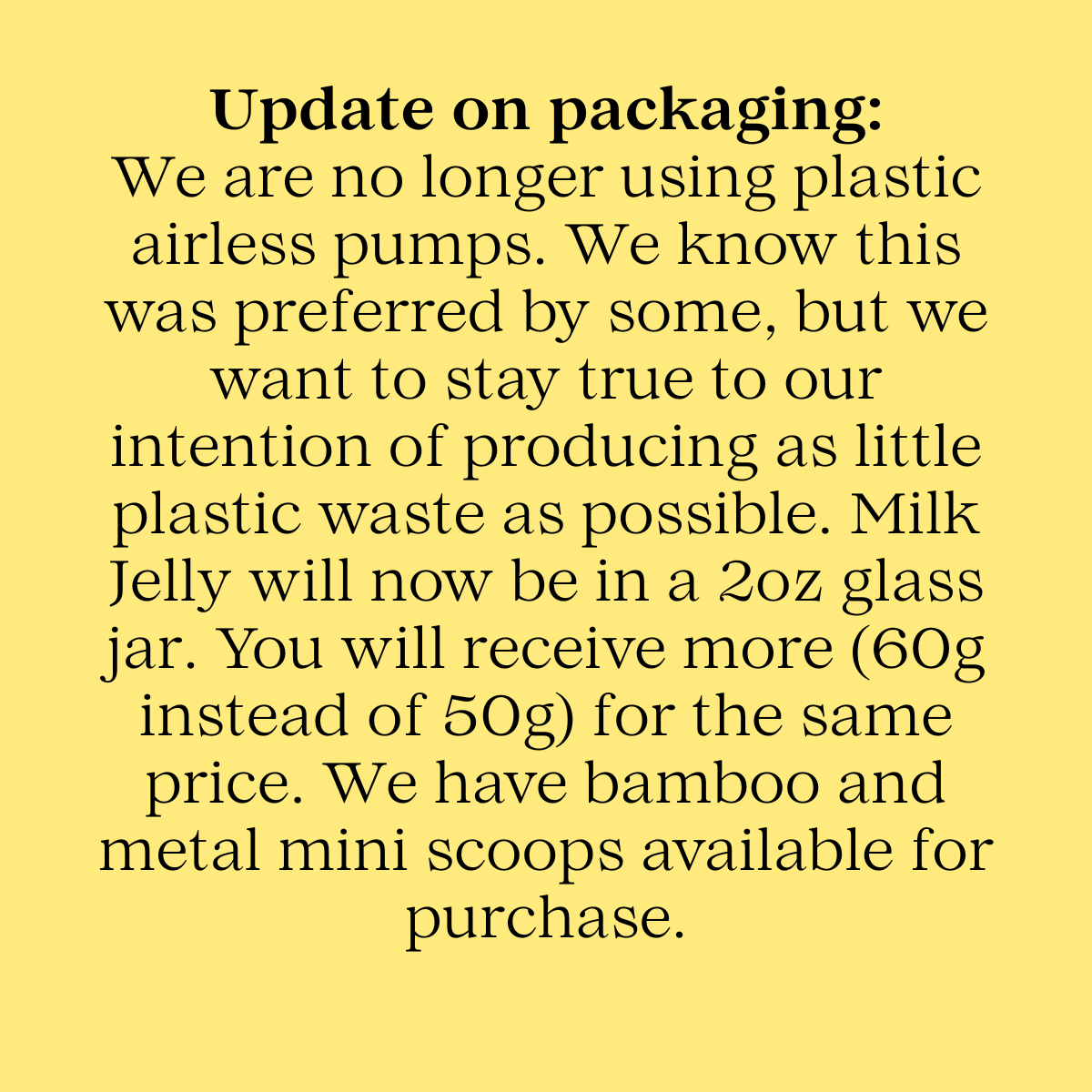 Sep 2025 | We are no longer using plastic airless pumps. Milk Jelly is now in a 2oz glass jar. You will receive more (60g instead of 50g) for the same price. We have bamboo and metal mini scoops available for purchase to ensure product does not come in contact with water in the jar