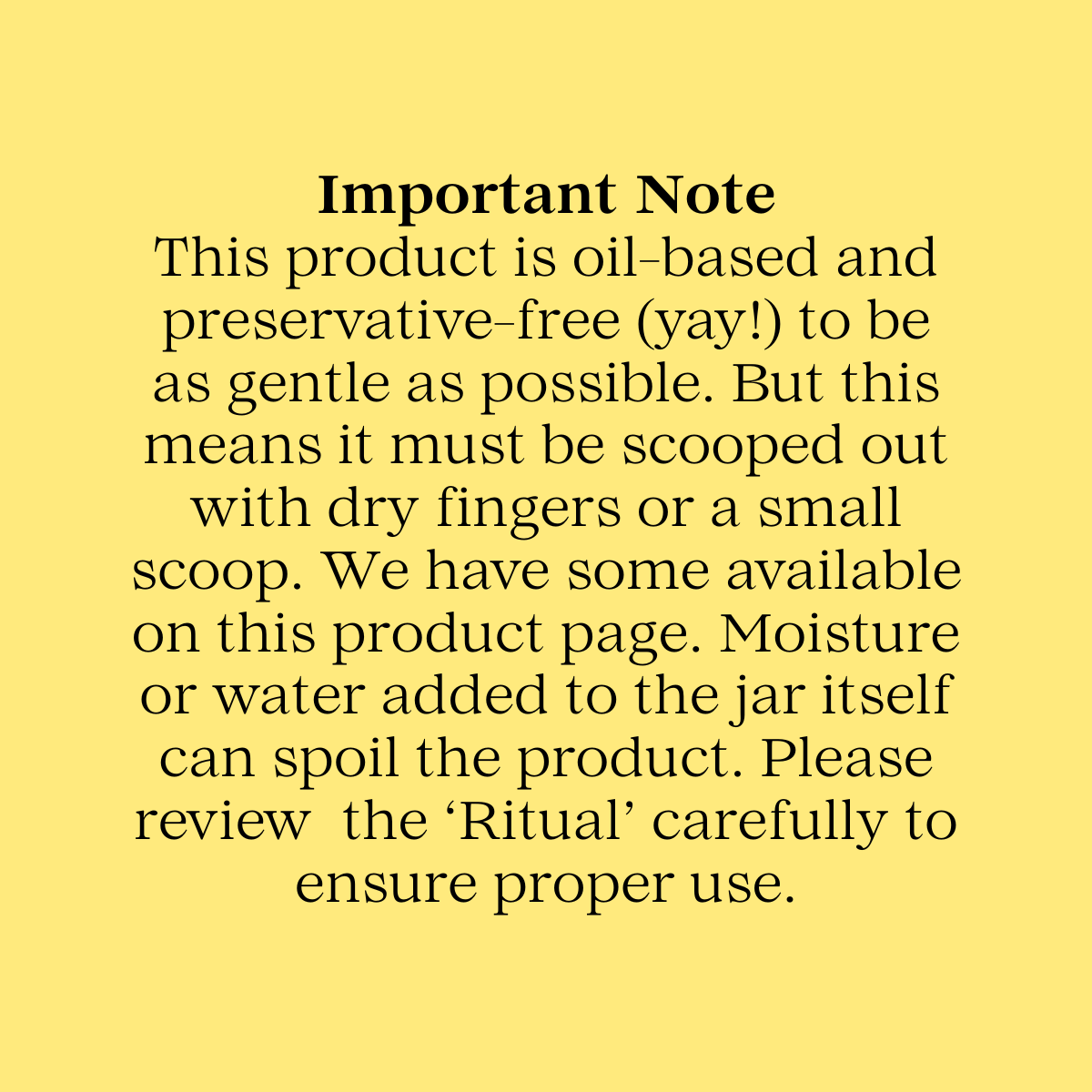 Always use a scoop or a clean, dry finger to scoop product out of the jar. Introducing water or moisture into the jar can cause spoilage.